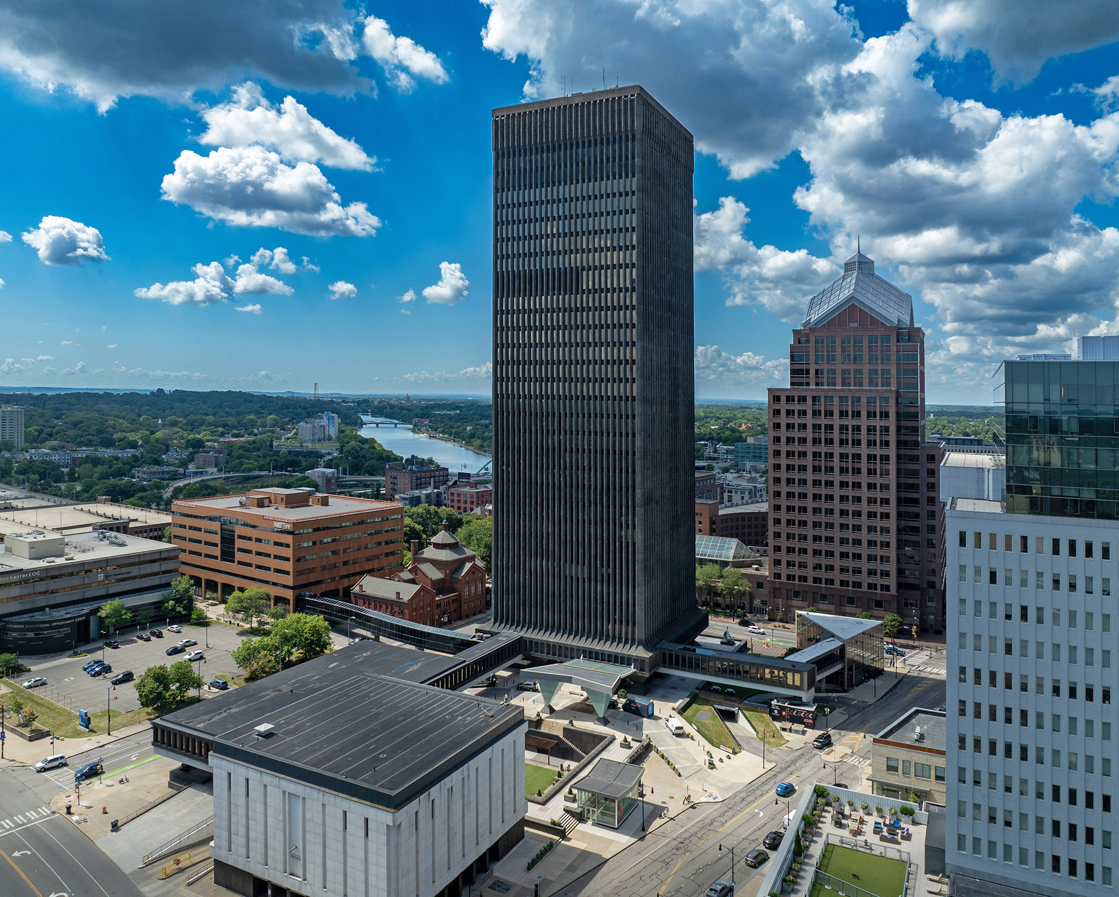 Former corporate tower repurposed into urban student housing.